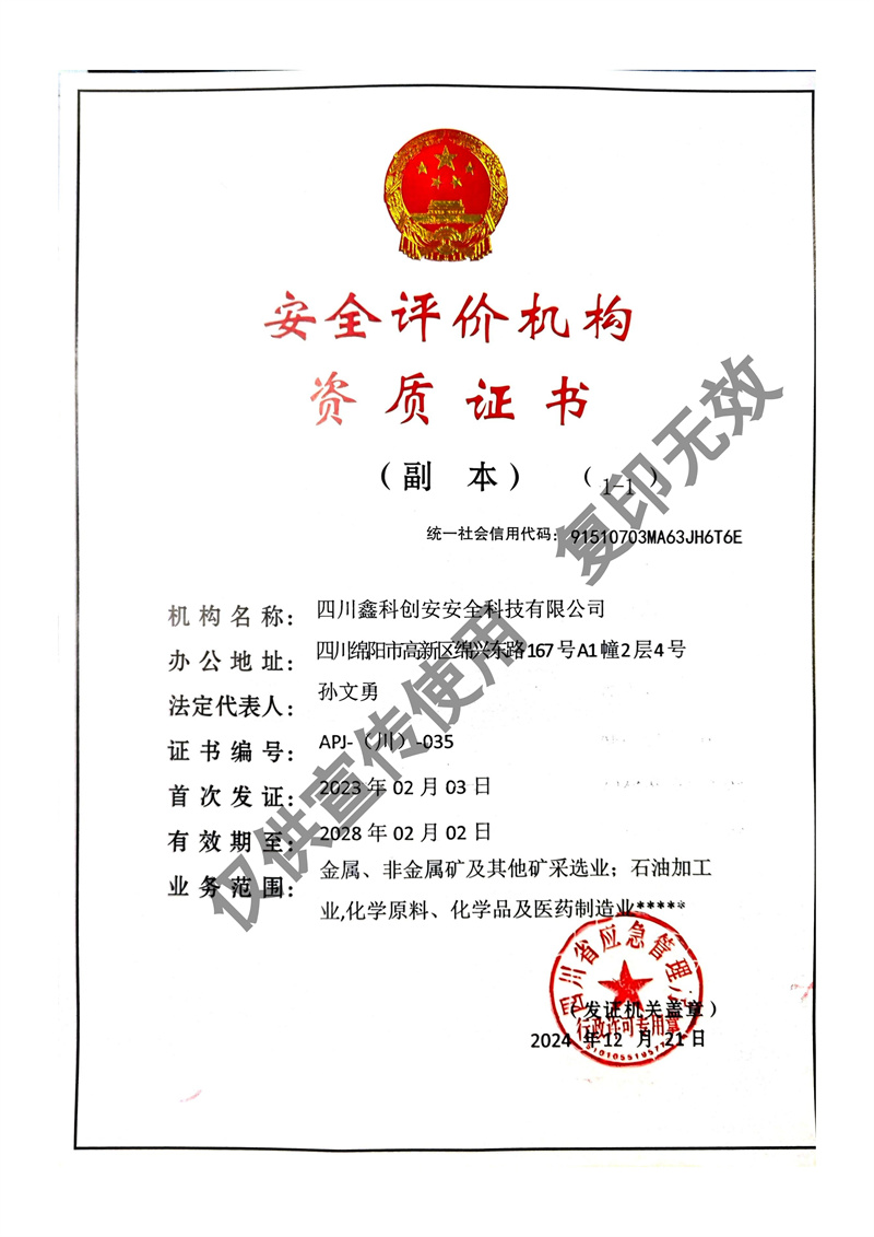 四川鑫科創(chuàng)安安全科技有限公司成立于2020年,是川北地區(qū)取得資質(zhì)的民營安全評價(jià)機(jī)構(gòu)(資質(zhì)證書編號:APJ-(川)-035)。并于2022年?duì)款^成立綜合應(yīng)急救援隊(duì)伍 - 綿陽曙光應(yīng)急救援中心。